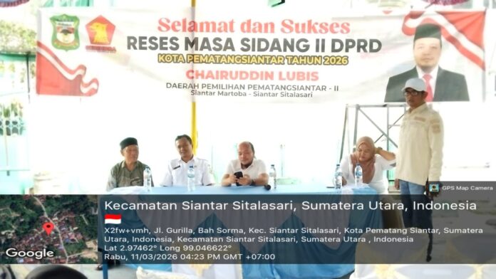 Pematangsiantar, Intainew | Reses masa sidang II angota DPRD Pematangsiantar Khairuddin Lubis menyerap aspirasi warga Kelurahan Bah Sorma Kecamatan Siantarsitalasari di lapangan Masjid Jalan Gurilla Rabu (11/03/2026).