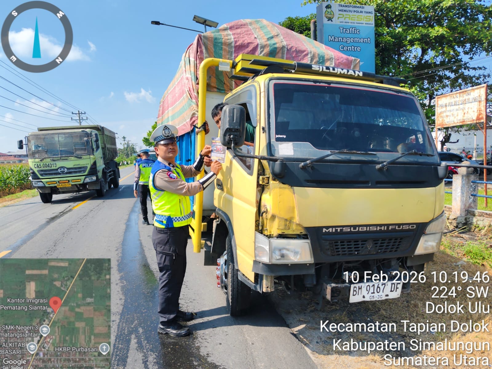 AIPTU Henry Pandiangan Pelaksana Lapangan Kegiatan Ops Keselamatan Toba Tahun 2026 Sat Lantas Polres Simalungun saat memberi edukasi tertib berlalulintas kepada Supir Truck ( Foto/istimewa)
