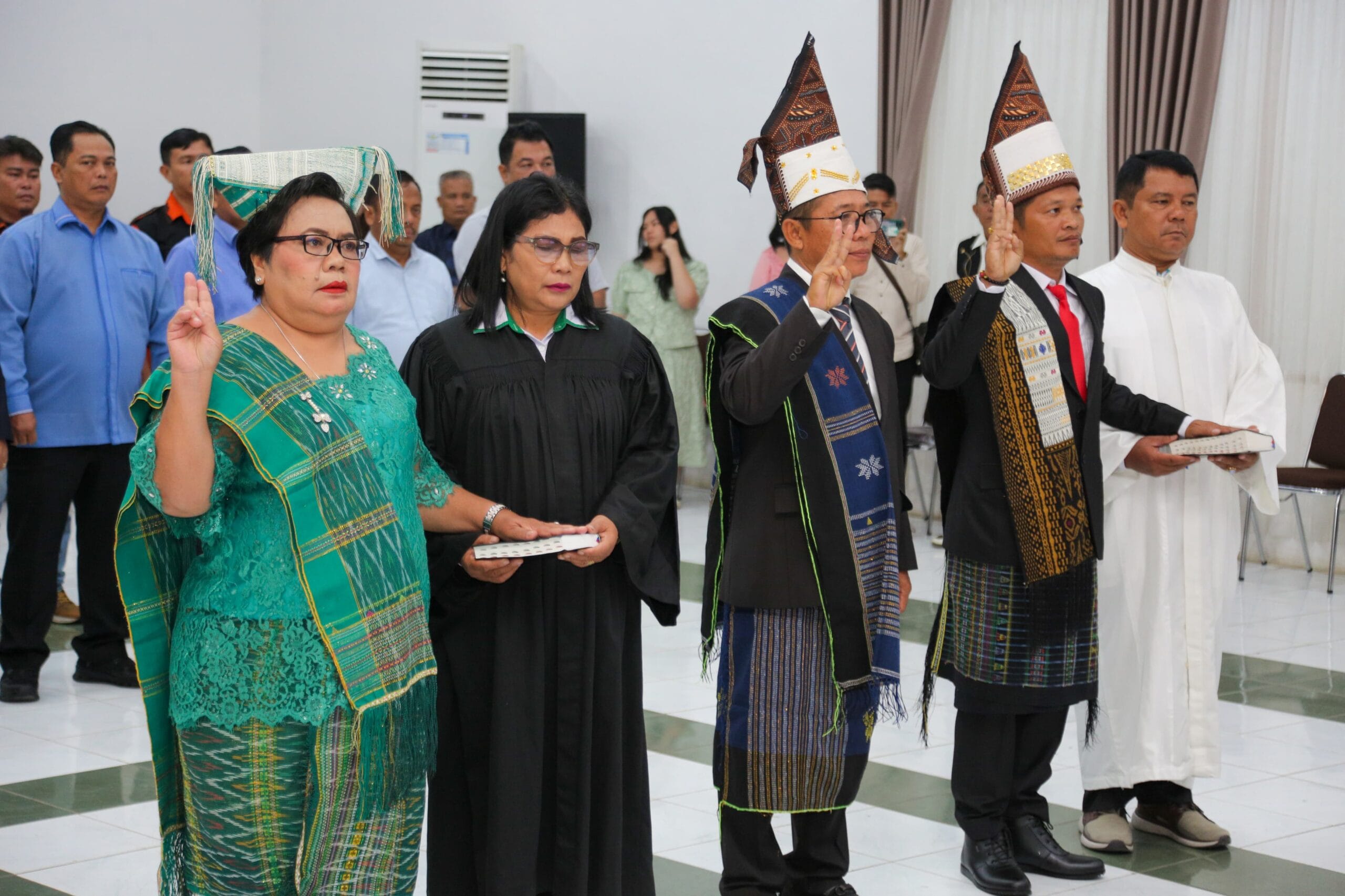 Tiga Dewan Pengawas PD PHJ saat mengangkat sumpah, Rosion Julietta Hutauruk SH MSi, Henry Dunand Sinaga SP, dan Wessi Pilipus Simbolon SPd. (Foto/Ist)